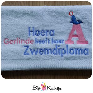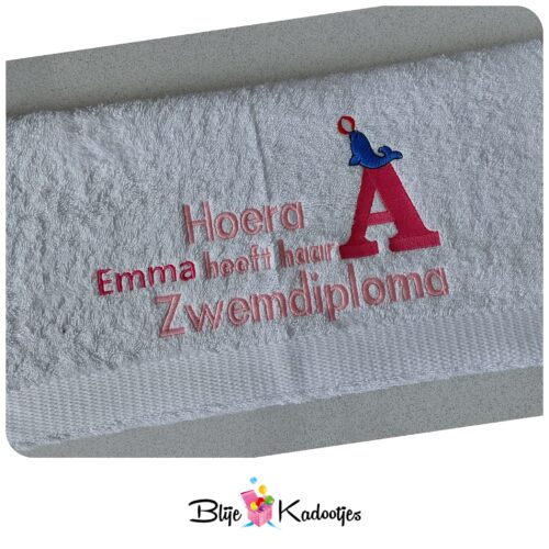 Maak zwemplezier nog specialer met onze unieke handdoek, voorzien van een geborduurd Zwemdiploma A en de naam van jouw kind! Deze handdoek is niet alleen praktisch voor het afdrogen na een verfrissende duik in het zwembad, maar ook een prachtig aandenken aan een belangrijke mijlpaal in de zwemcarrière van je kleintje.