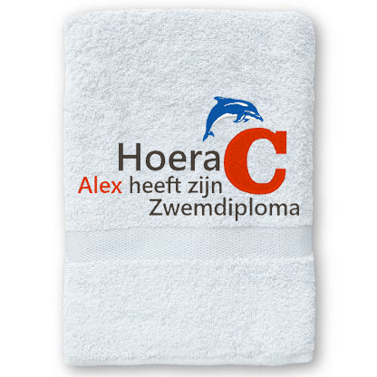 Onze handdoek is gemaakt van hoogwaardig, 100 % zacht katoen dat zorgt voor een luxe gevoel op de huid. Met een ruime afmeting biedt hij voldoende ruimte om comfortabel in te wikkelen na het zwemmen. De borduring met het Zwemdiploma C is niet alleen een erkenning van hun prestatie, maar maakt de handdoek ook uniek en persoonlijk omdat de naam van het kind er ook bij is geborduurd. Kies zelf de kleuren en jouw handdoek is helemaal uniek! Elk kind zal trots zijn om deze handdoek mee te nemen naar zwemles of het zwembad, en het is een geweldige manier om hun enthousiasme voor zwemmen te stimuleren.