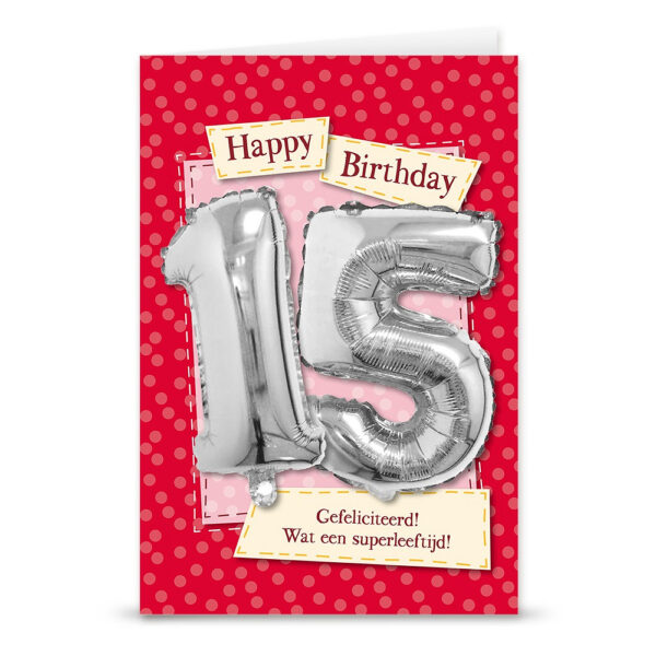 Maak verjaardagen en speciale mijlpalen onvergetelijk met de Leeftijd ballon 15 jaar op en in een kaart. Deze unieke combinatie van een feestelijke kaart en een schitterende ballon is het perfecte cadeau voor iedereen die je een persoonlijk en vrolijk gebaar wilt geven. De ballon in de kaart is gemaakt van zilverkleurige aluminium folie, waardoor hij glanst en direct in het oog springt.