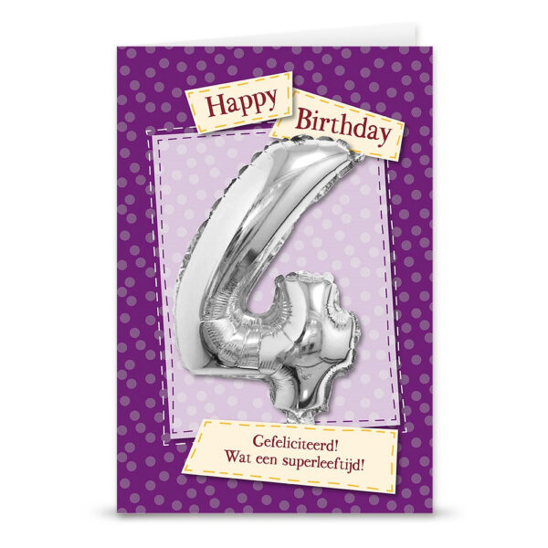 Maak verjaardagen en speciale mijlpalen onvergetelijk met de Leeftijd ballon 4 jaar op en in een kaart. Deze unieke combinatie van een feestelijke kaart en een schitterende ballon is het perfecte cadeau voor iedereen die je een persoonlijk en vrolijk gebaar wilt geven. De ballon in de kaart is gemaakt van zilverkleurige aluminium folie, waardoor hij glanst en direct in het oog springt.